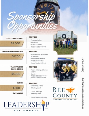 We are excited to share sponsorship opportunities for the upcoming Leadership Bee County 2025–2026 program. As a sponsor, you’ll play a direct role in empowering future leaders while gaining visibility through social media recognition and event exposure. Whether you choose to support a specific initiative—like our State Capitol Trip, Graduation Ceremony, Team Building Course, or Monthly Lunches—your contribution helps us create an impactful and memorable experience for participants. Each sponsorship tier offers tailored benefits and high-value community engagement. If you're interested in aligning your brand with leadership development and community growth, we’d love to connect with you!