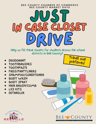 The Bee County Chamber of Commerce and Bee County Market Days are collecting hygiene essentials to stock “Just In Case Closets” for students across all Bee County school districts. These items make a real difference in a child’s day—and we’re inviting our community to step in and help.