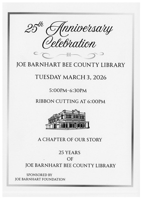 Celebrate 25 years of literacy, learning, and community connection at the Joe Barnhart Bee County Library. Enjoy an evening honoring the library’s legacy and the important role it continues to play in Bee County.